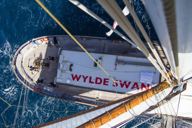 De twee 40 meter lange masten en de extreem grote zeilen domineren het silhouet van de Wylde Swan. Aan dek is veel ruimte om met je groep samen te komen, maar er zijn ook stille hoekjes om je even terug te trekken van de drukte aan boord.